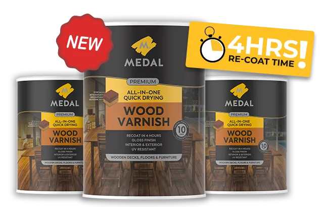 Medal Premium solvent-based All in One Quick Drying Wood Varnish is a UV resistant, self-priming, preservative topcoat.